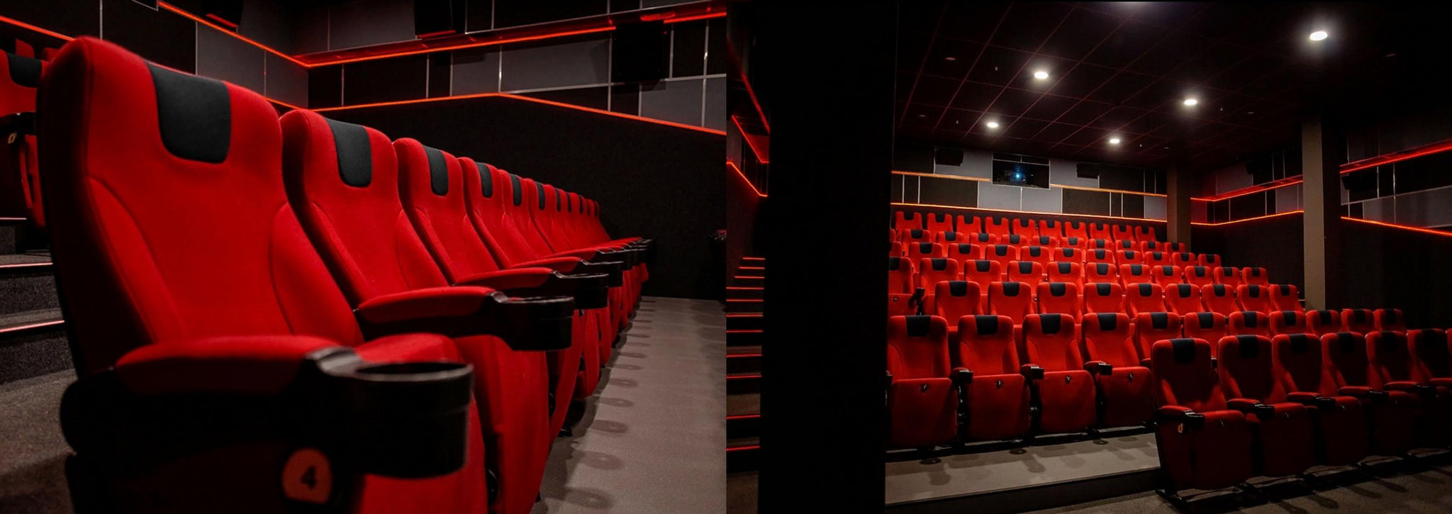 Оптимальное количество удобных итальянских кресел на 1 кинозал позволяет разместить 72-74 человека единовременно в предельно комфортных условиях, а красно-черная обивка подчеркивает дерзкий дизайн зала.